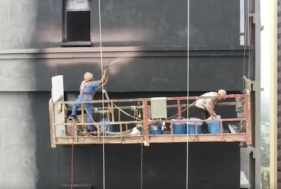 多功能?chē)娡繖C(jī)真石漆噴涂工地施工現(xiàn)場(chǎng)演示……